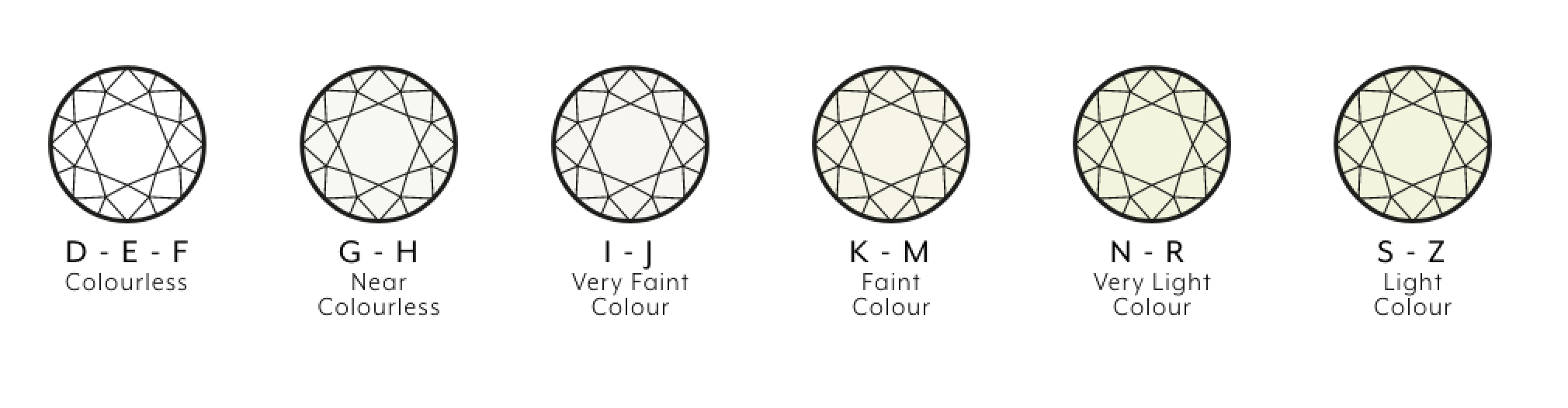 G-J grade diamonds are grouped as near colourless. When in a setting, they will appear more or less white, however when loose and compared to colourless diamonds, a tint in the stones will be noticeable.
