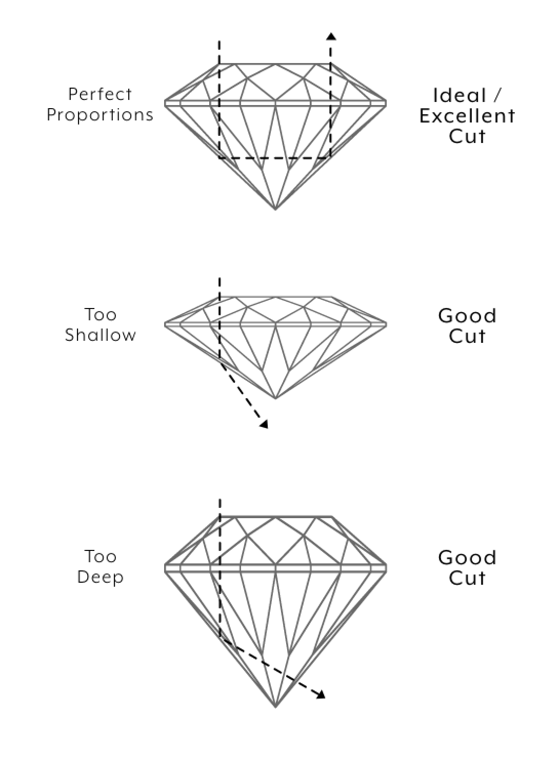 When diamonds are cut too shallow or too deep, the diamond will not look brilliant and in some cases appear dark or empty in the centre.